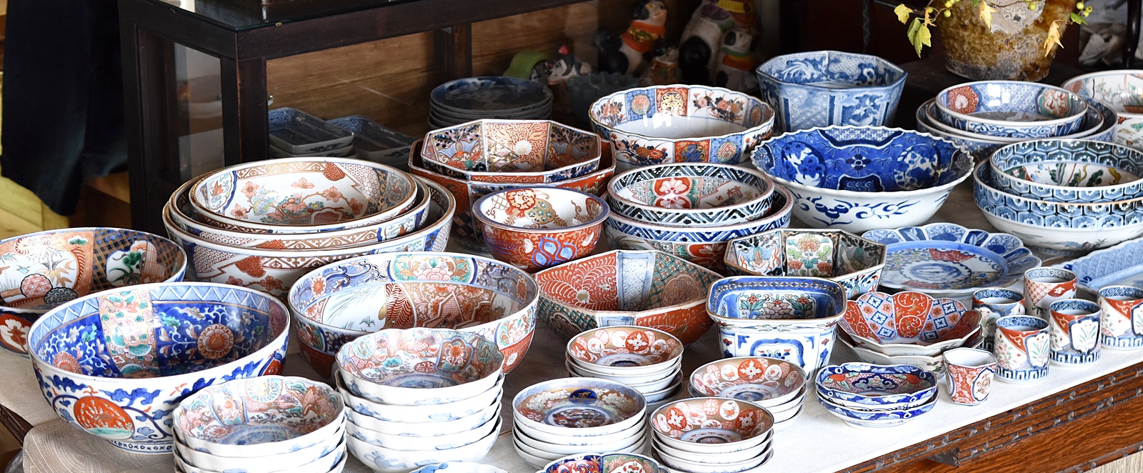 伊万里 色絵 扇面に梅菊鳥 鶴亀龍よろけ模様 鉢 小