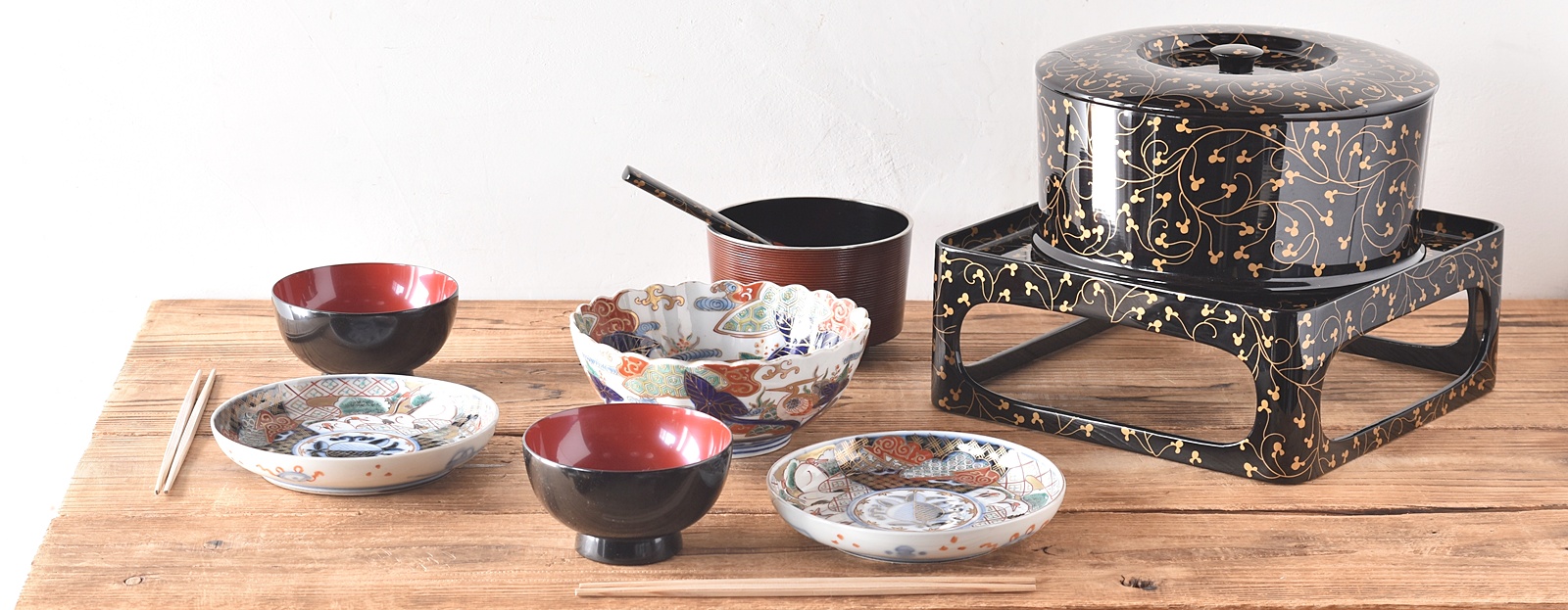 天然木製漆塗 唐草金蒔絵 飯器 台 杓文字 3点セット