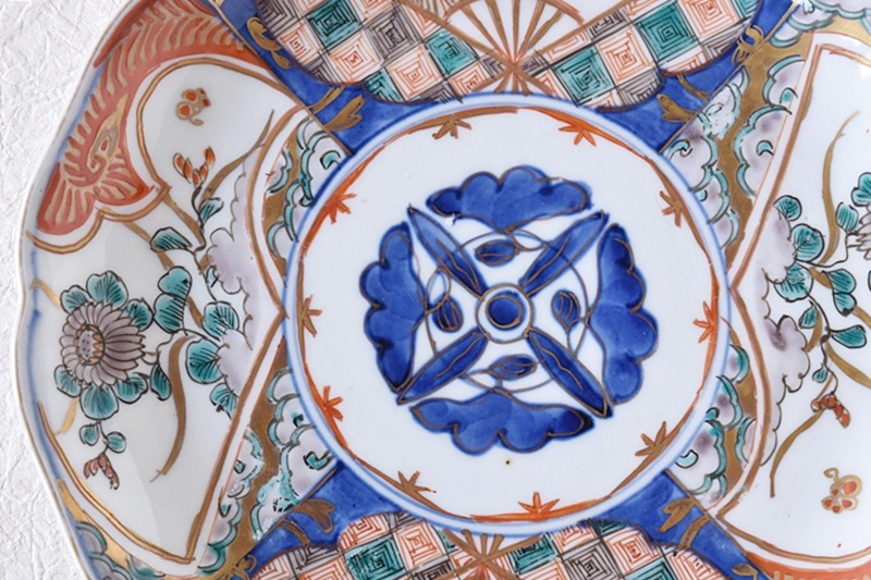 伊万里 色絵 扇面に花 輪花型 七寸皿