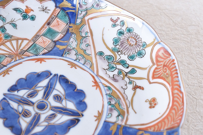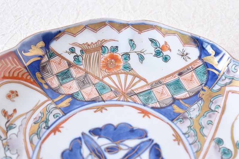 伊万里 色絵 扇面に花 輪花型 七寸皿