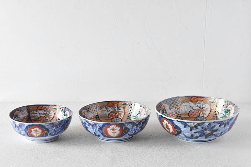 伊万里 色絵 草花 雪輪 竹に雀 草花模様 二重高台 三つ鉢 大