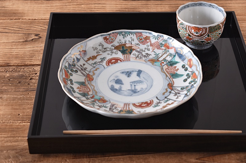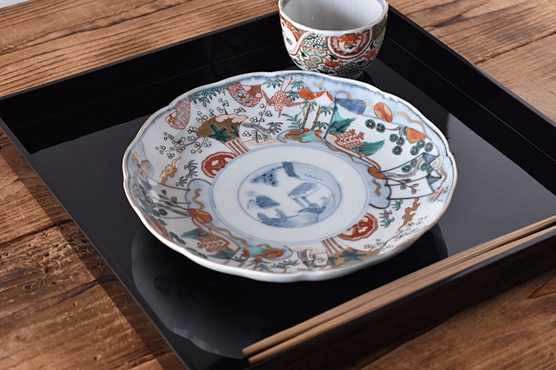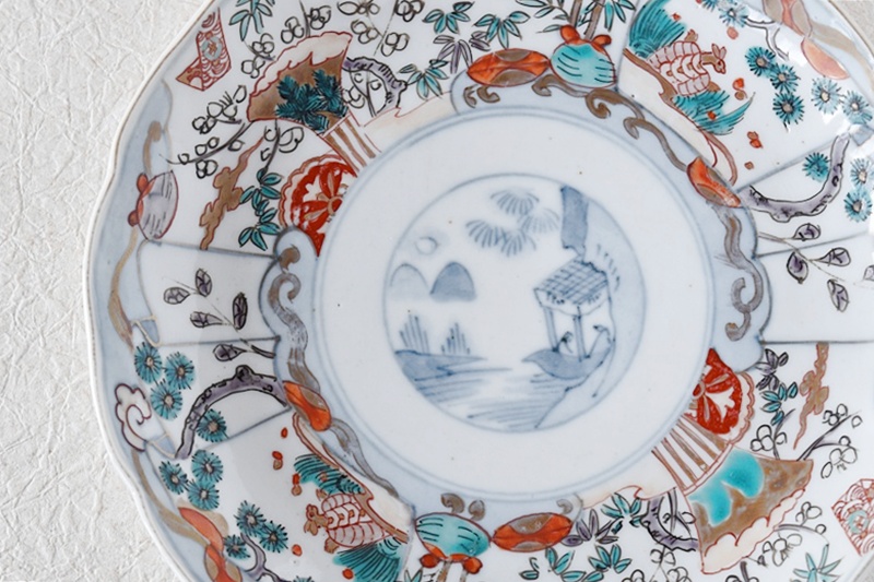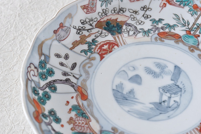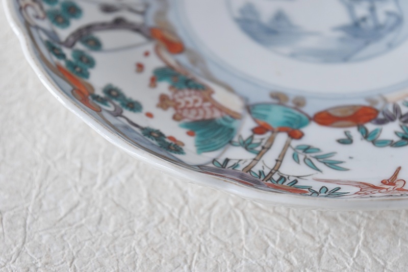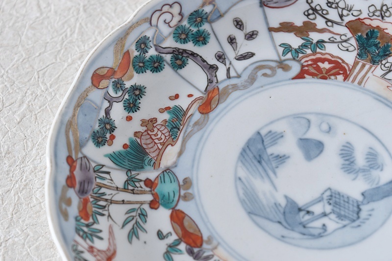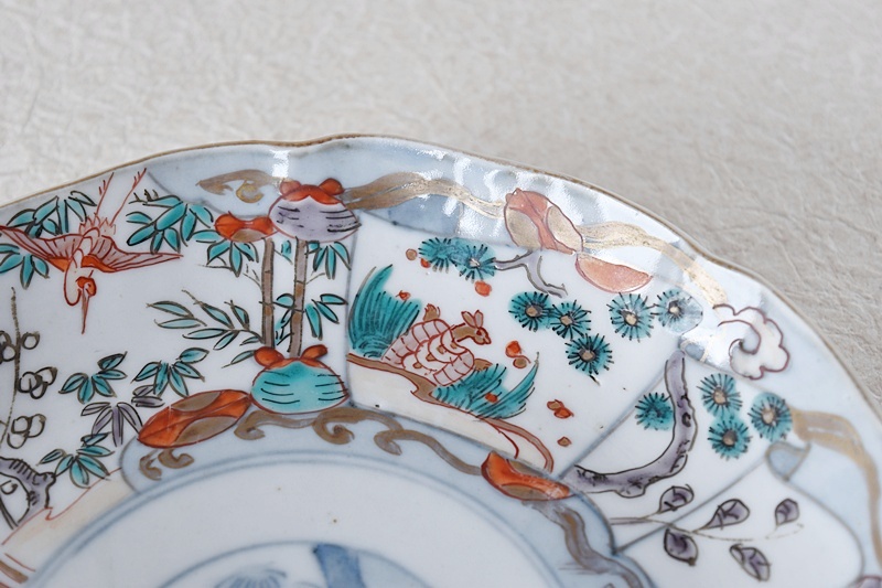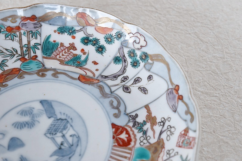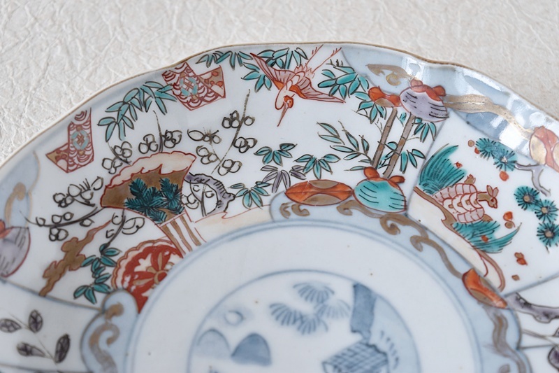 伊万里 色絵 鶴亀松竹梅 貝合わせ 輪花型 七寸皿