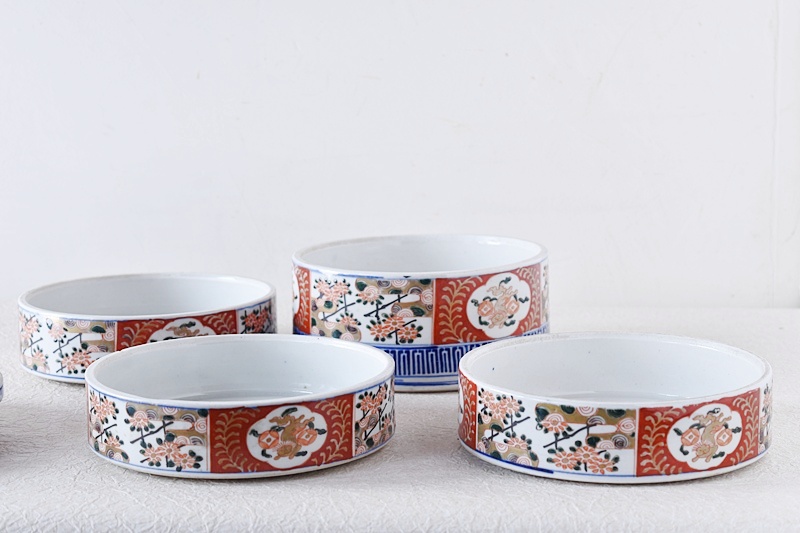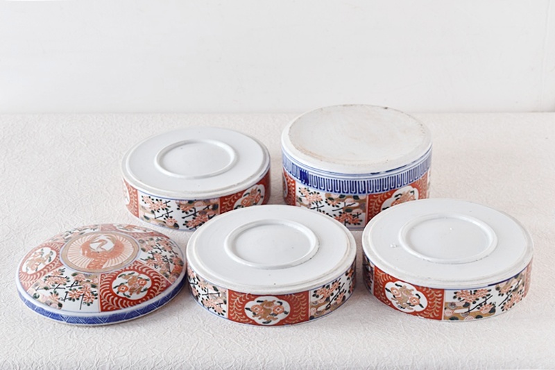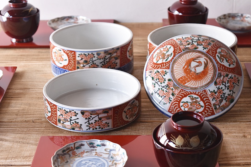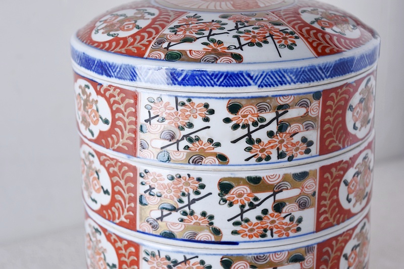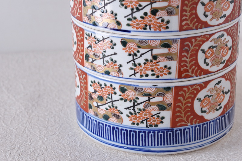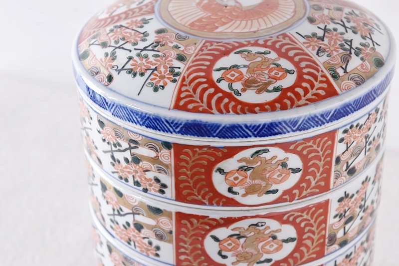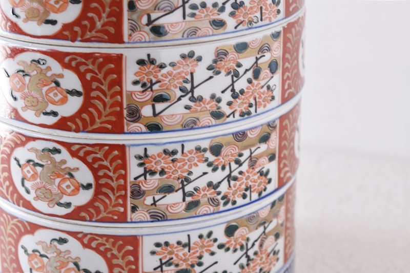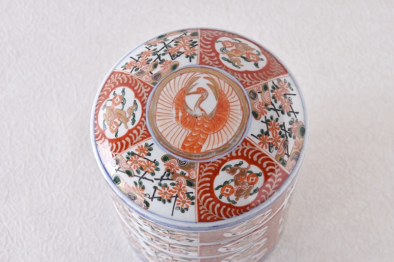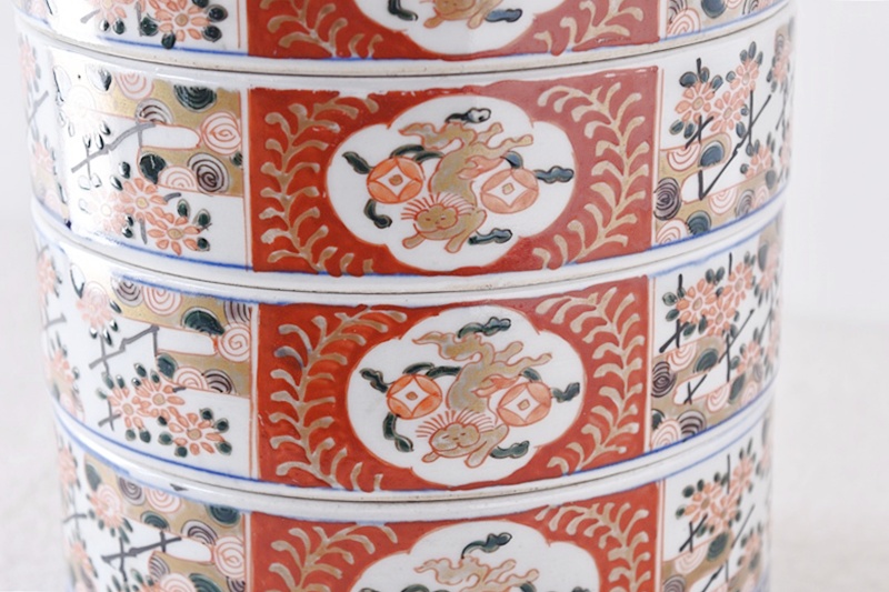 伊万里 色絵赤絵 鶴唐獅子垣根に菊花 四段段重Sold Out