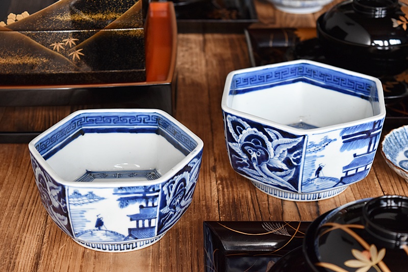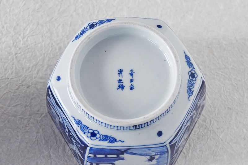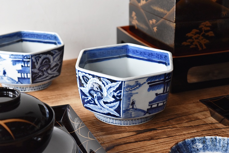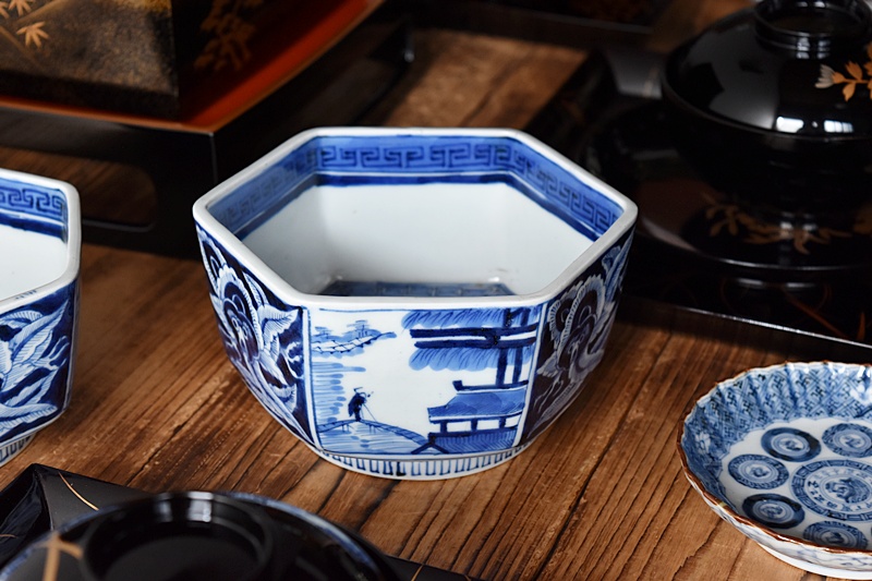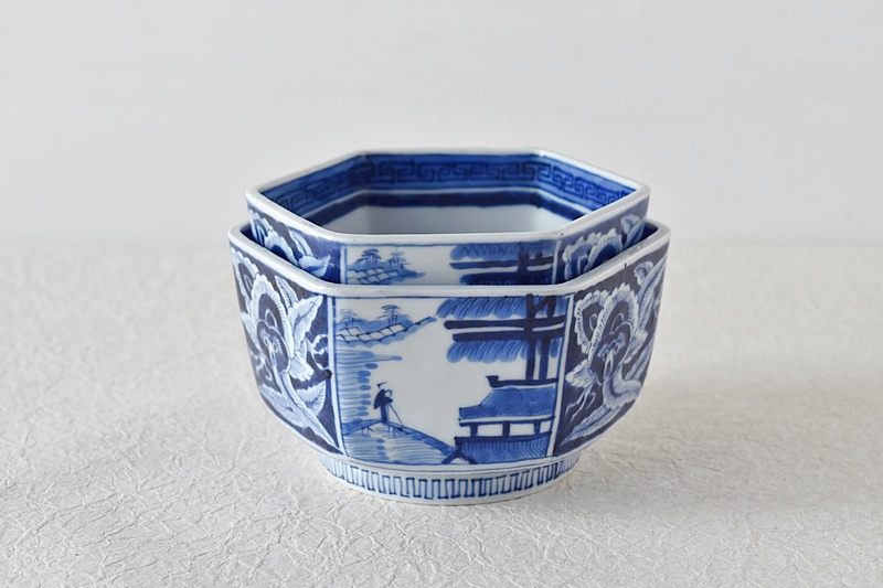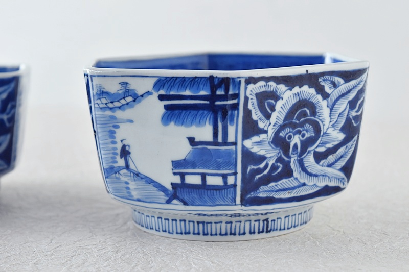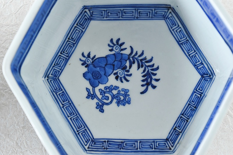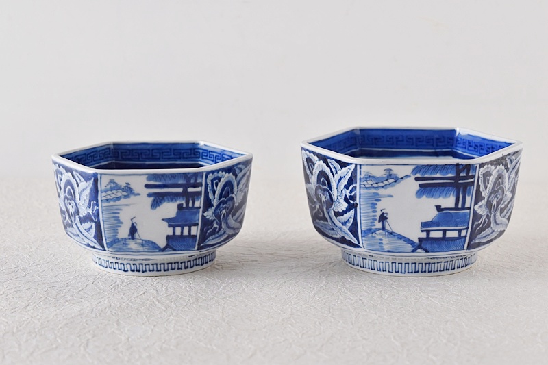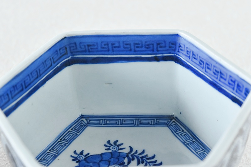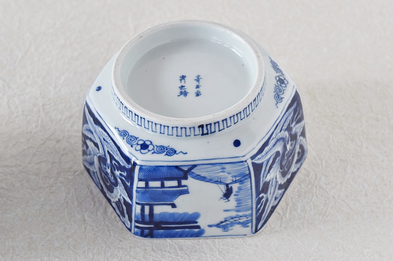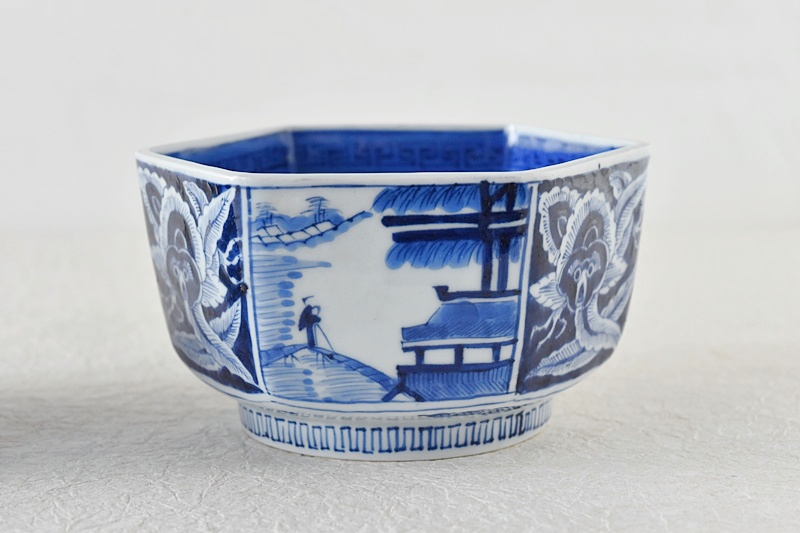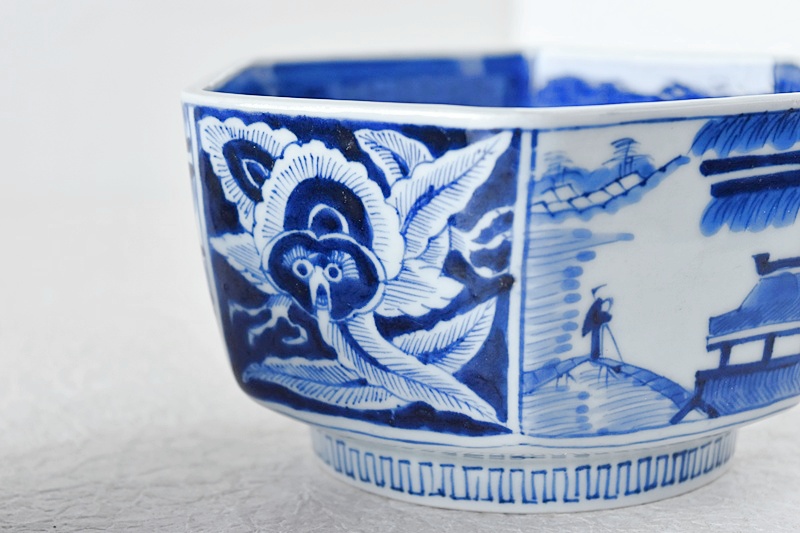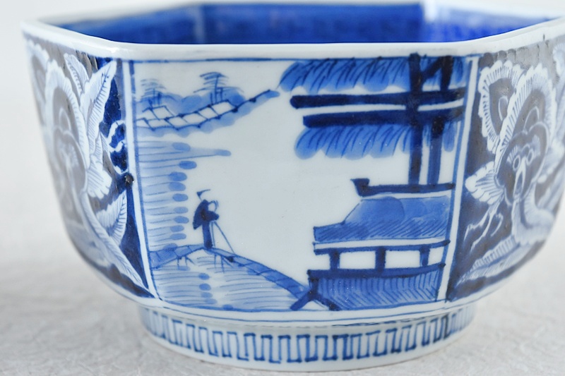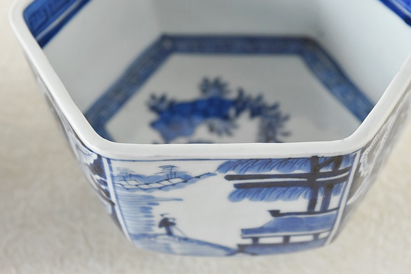 古伊万里 染付 山水人物風景画 竒玉宝鼎之珍 六角鉢 大