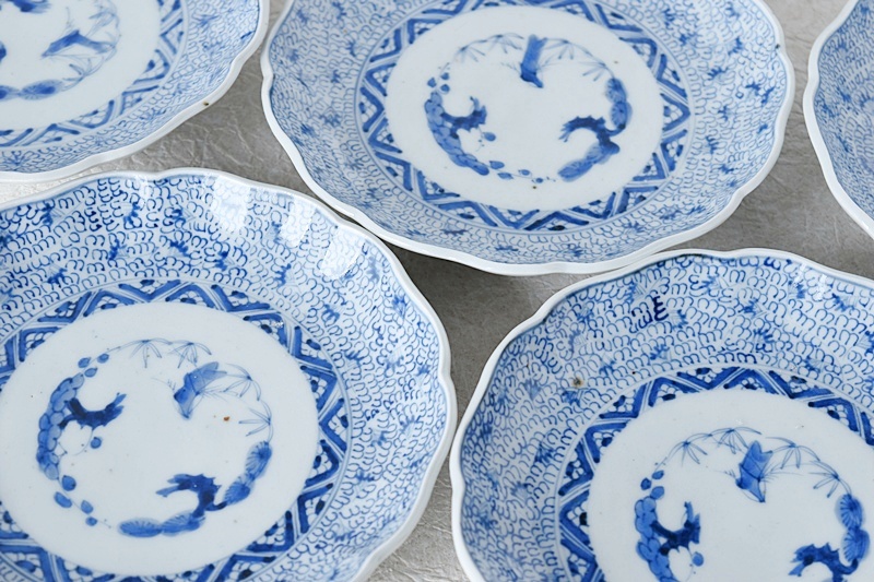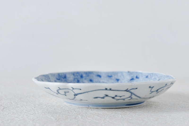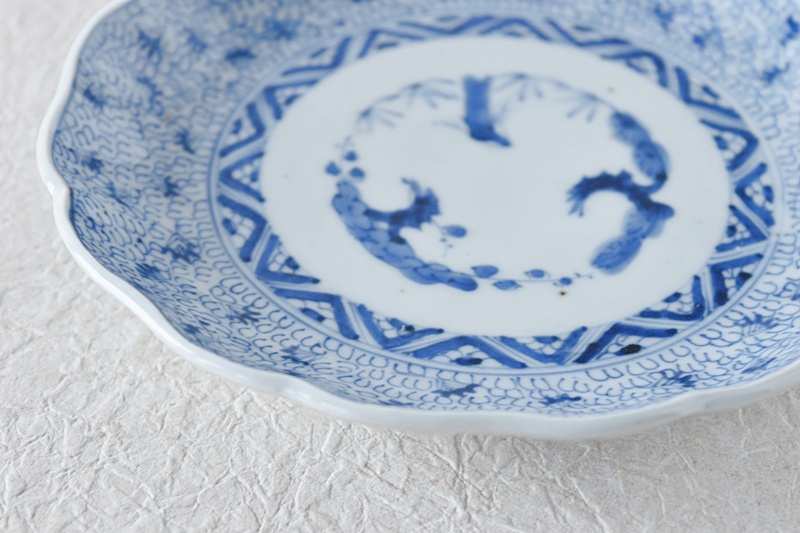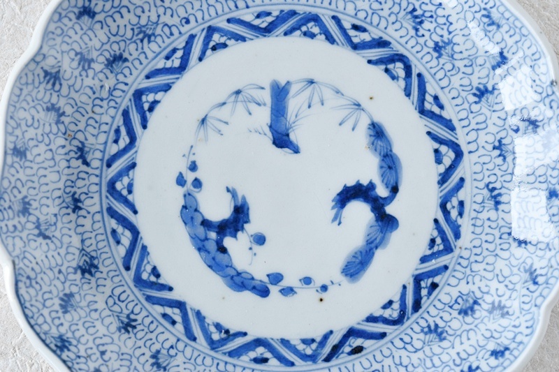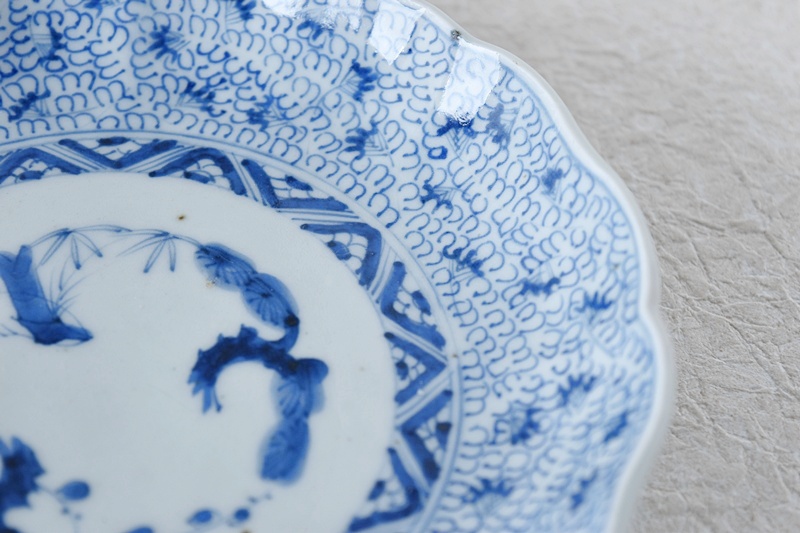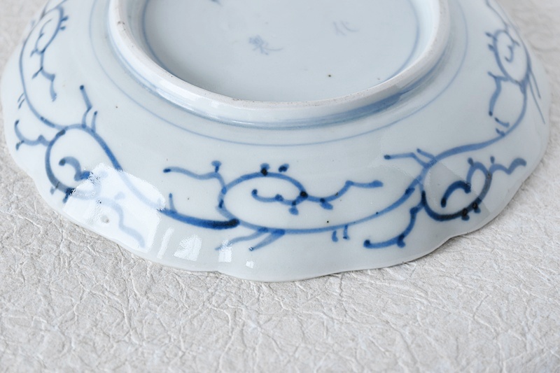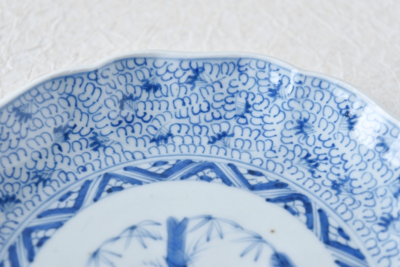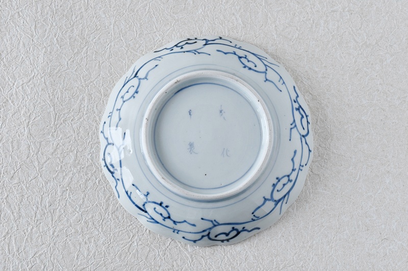 古伊万里 染付 微塵唐草 成化年製文 輪花型 六寸皿