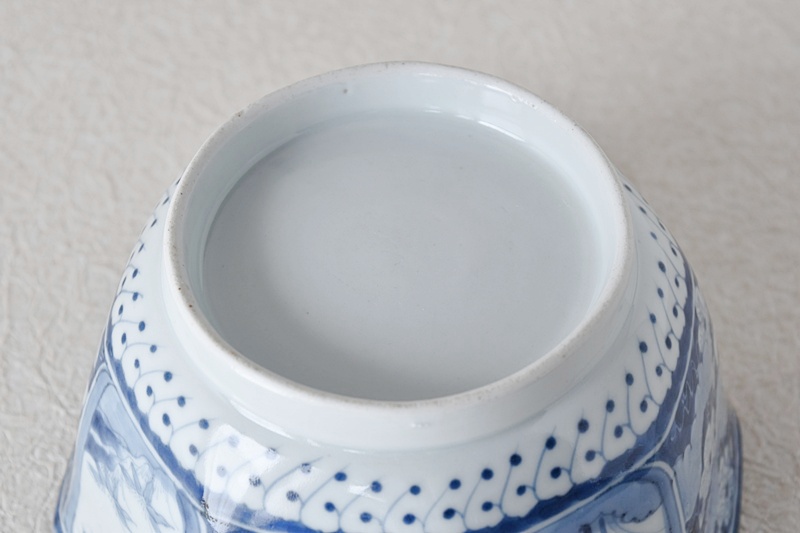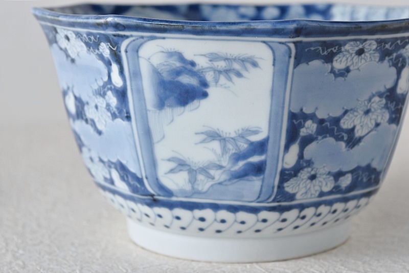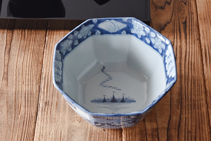 古伊万里 染付 竹瓢箪桐秋草紫陽花雪輪 干し網に雁 八角鉢