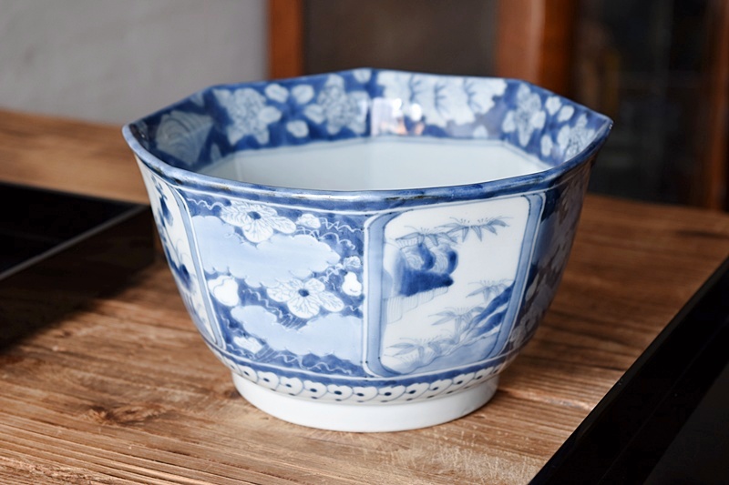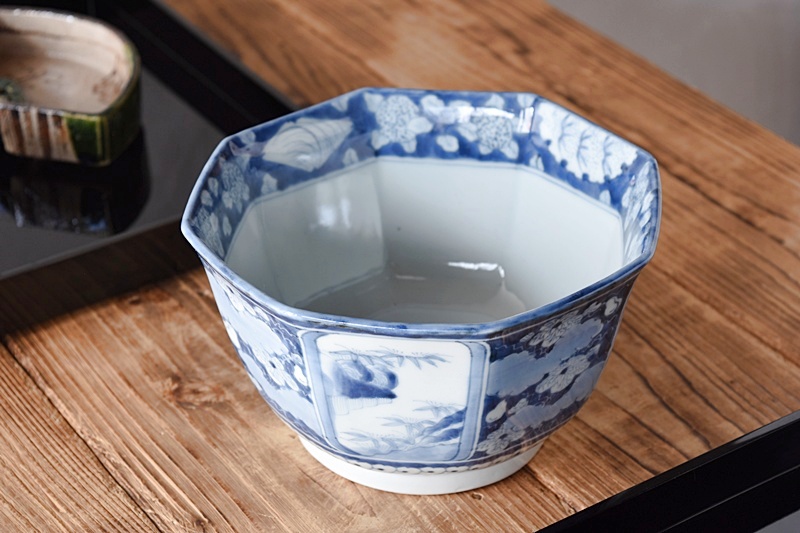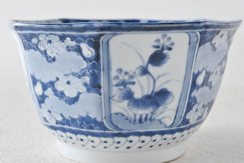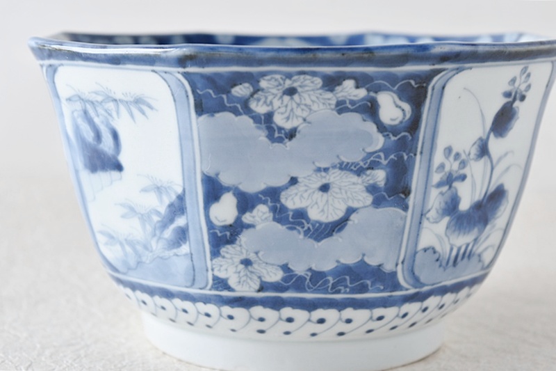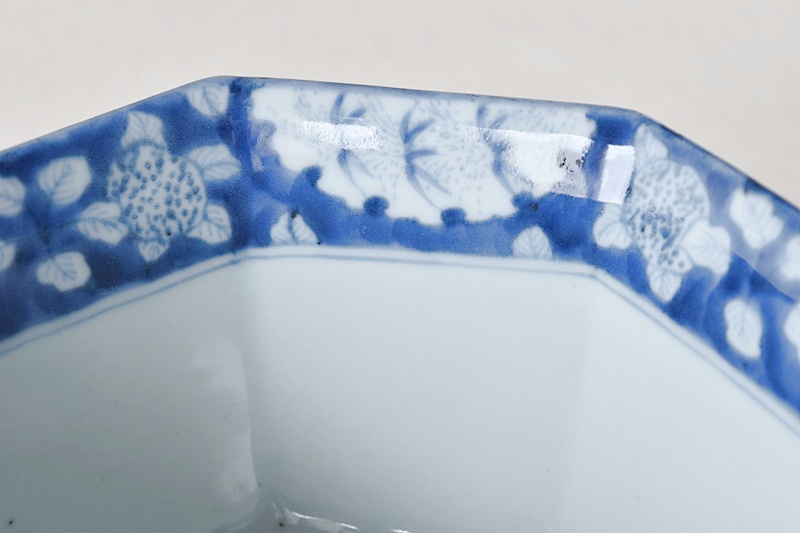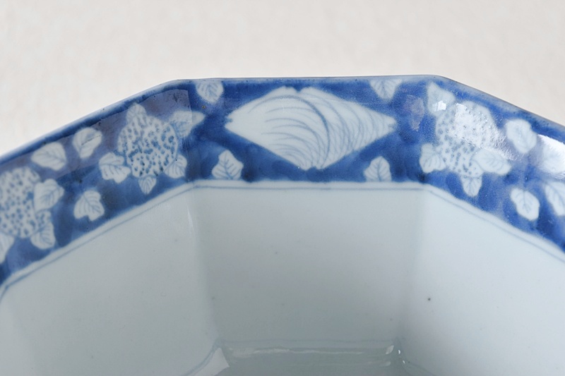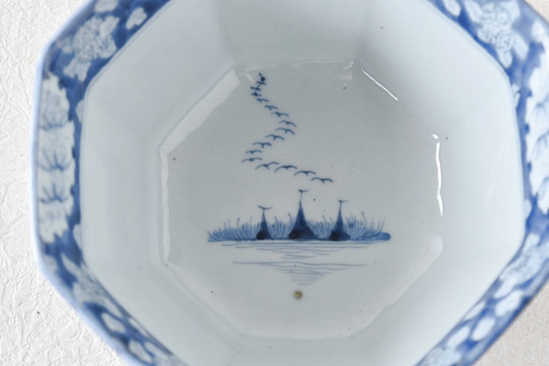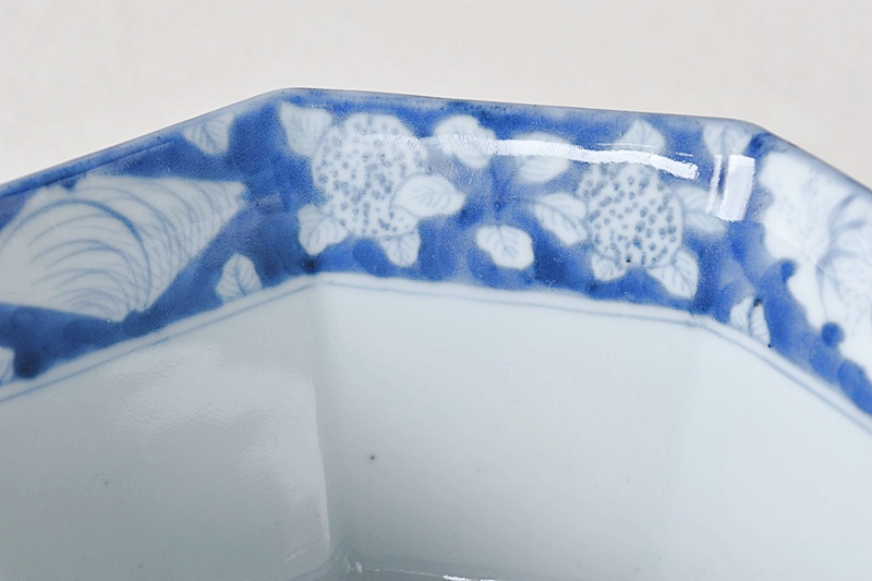 古伊万里 染付 竹瓢箪桐秋草紫陽花雪輪 干し網に雁 八角鉢