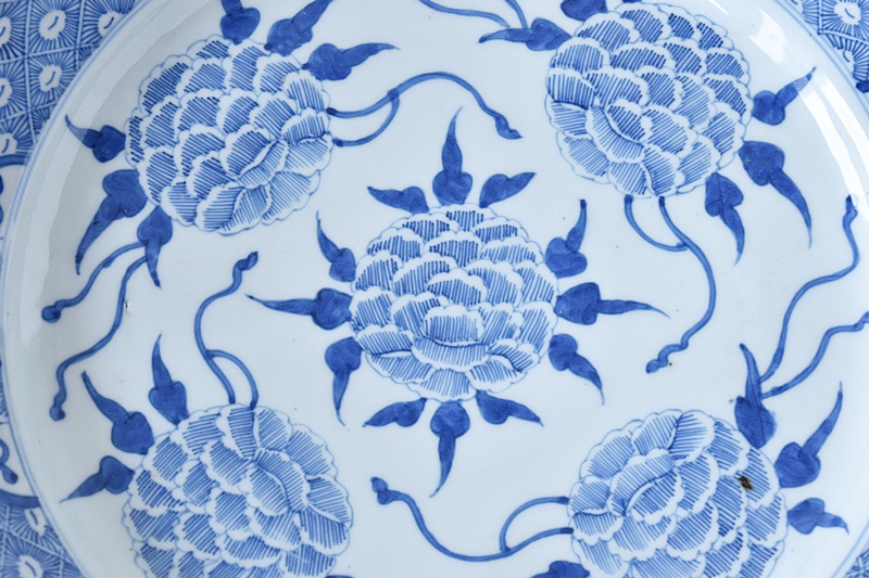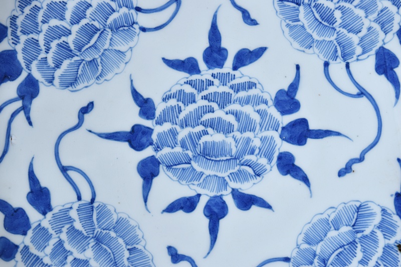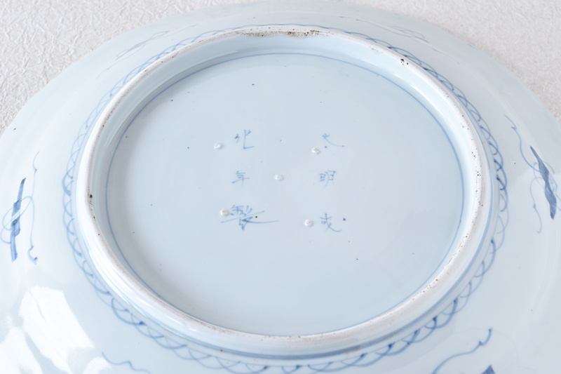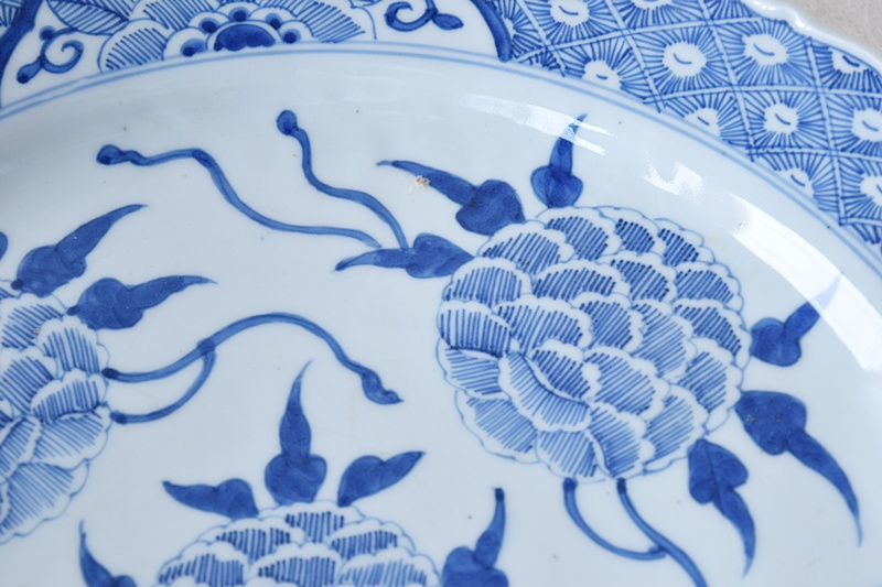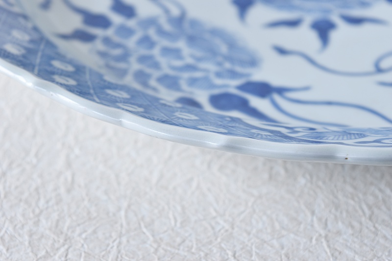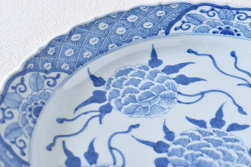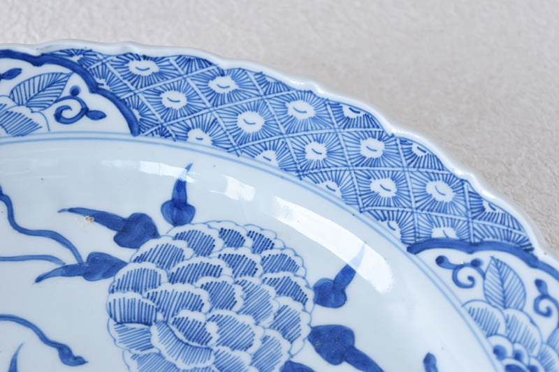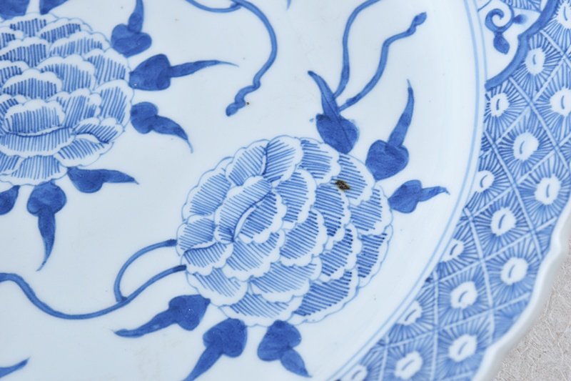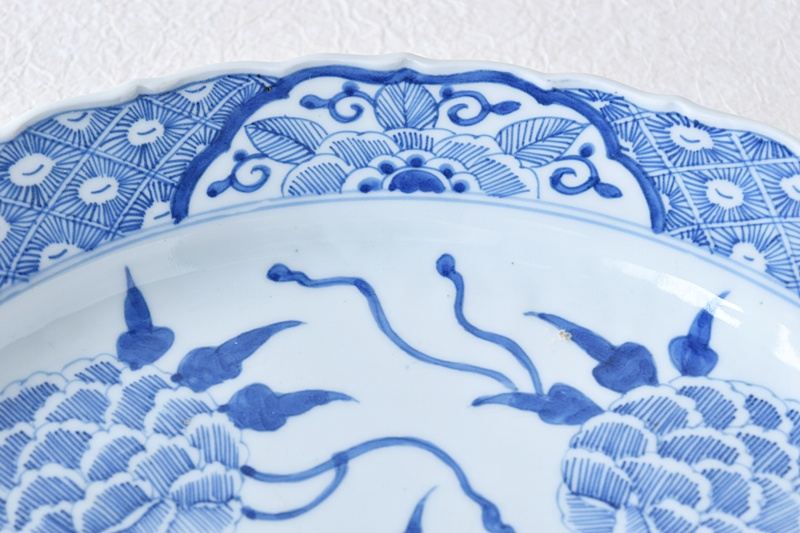 古伊万里 染付 線描き 牡丹尽くし 太明成化年製文 輪花型 大皿