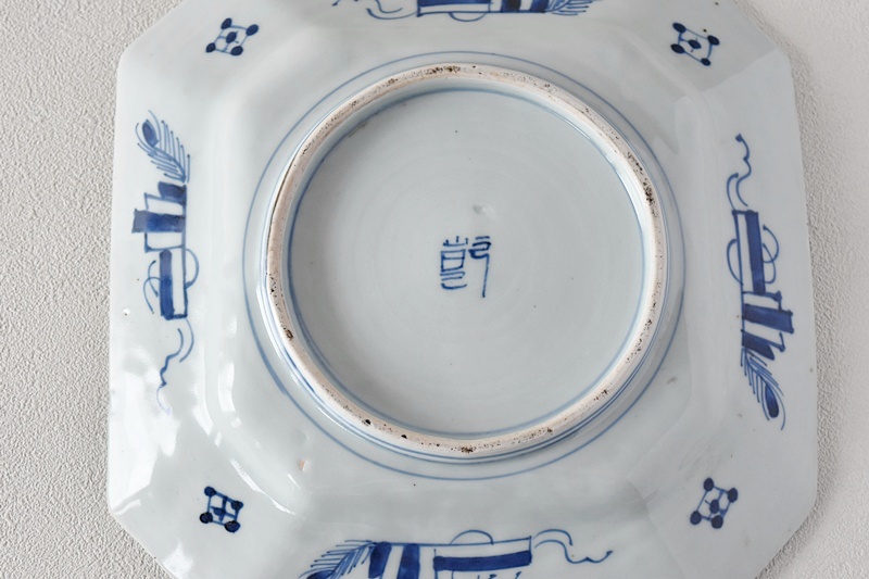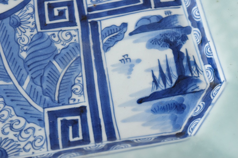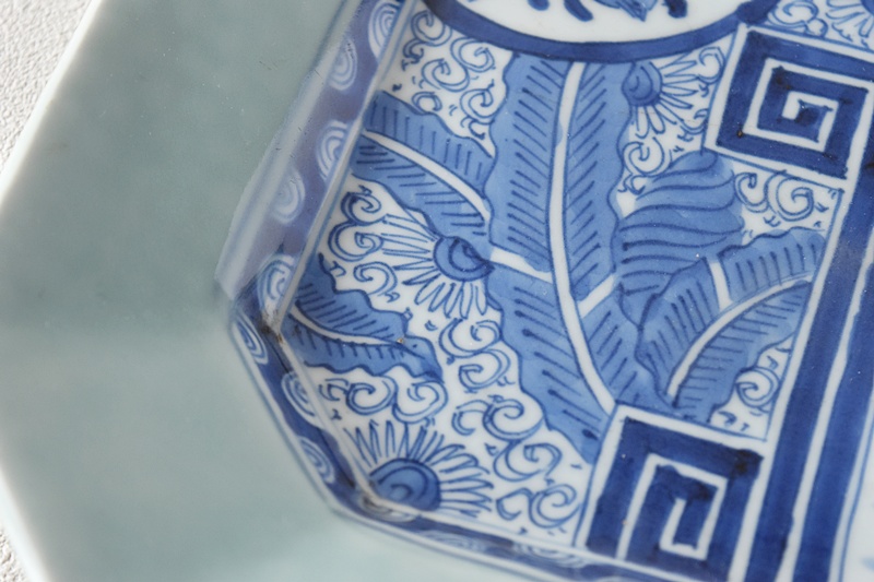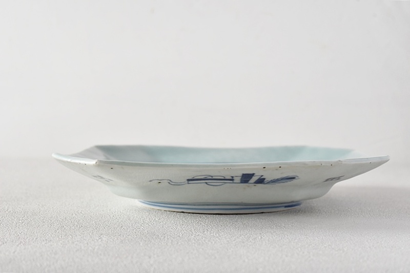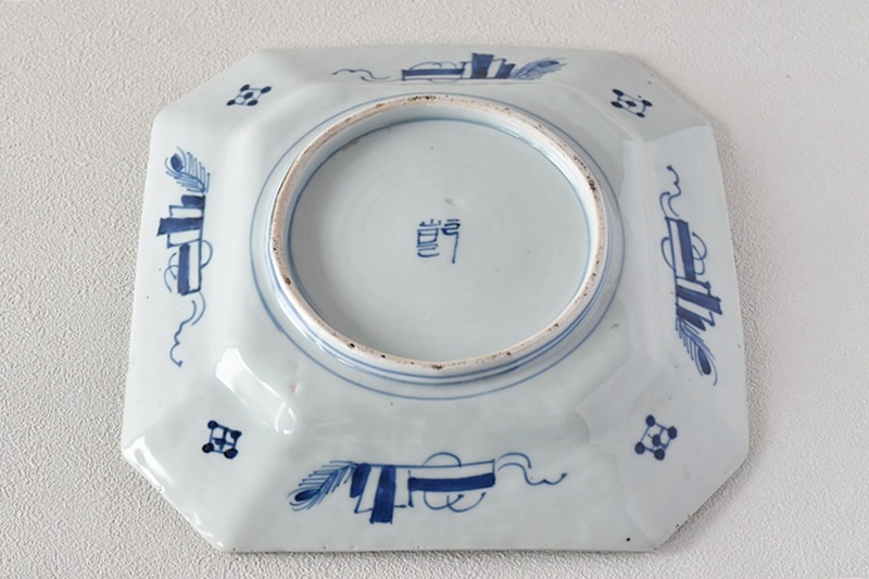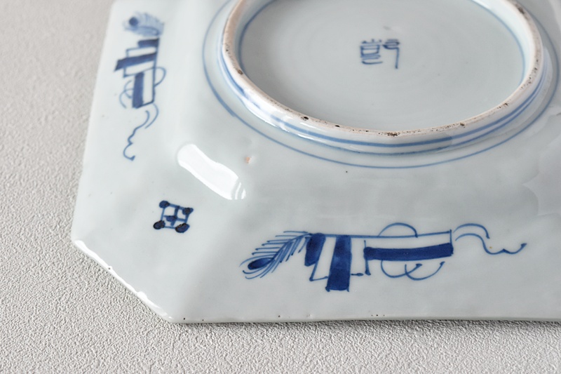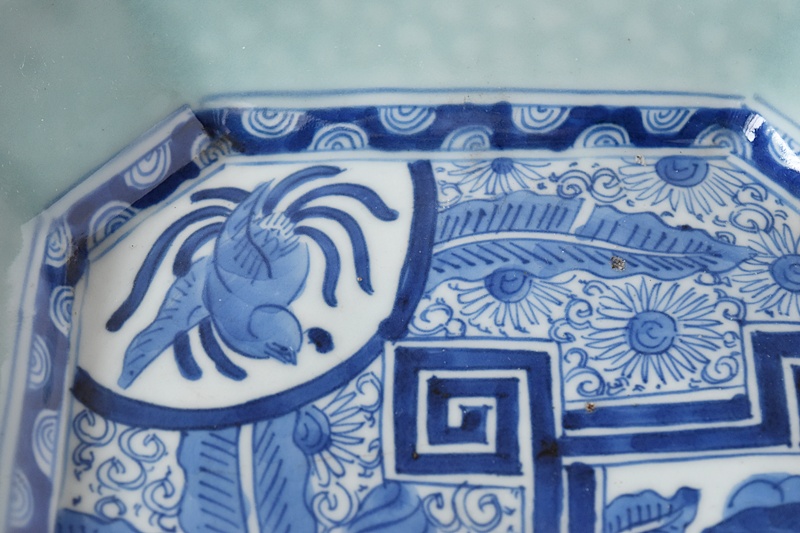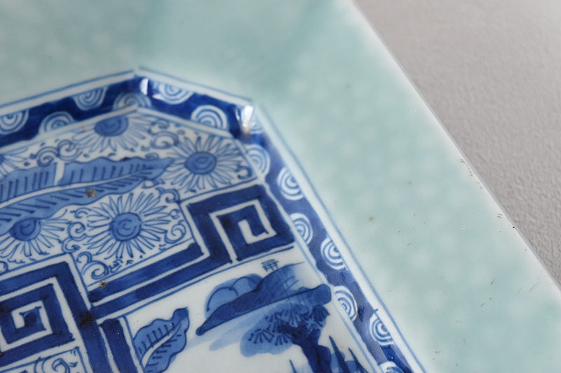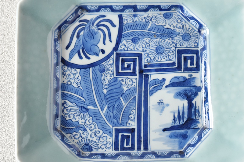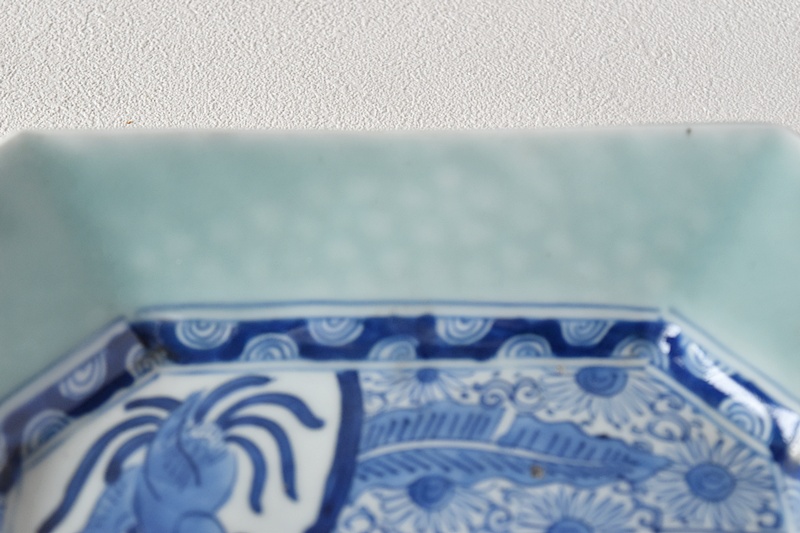 古伊万里 青磁染付 窓絵に鳳凰網干図 花と唐草芭蕉 隅切り角皿Sold Out