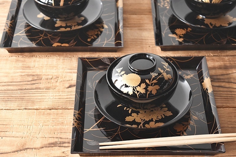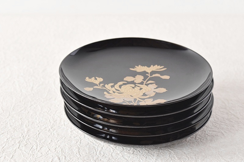 天然木製漆塗 時代蒔絵 菊図変わり金銀蒔絵 菓子皿 5客セット その一Sold Out