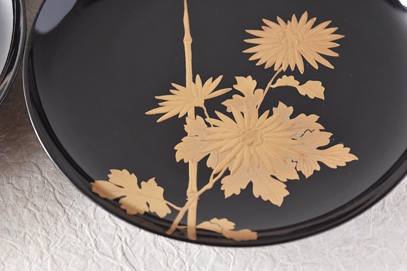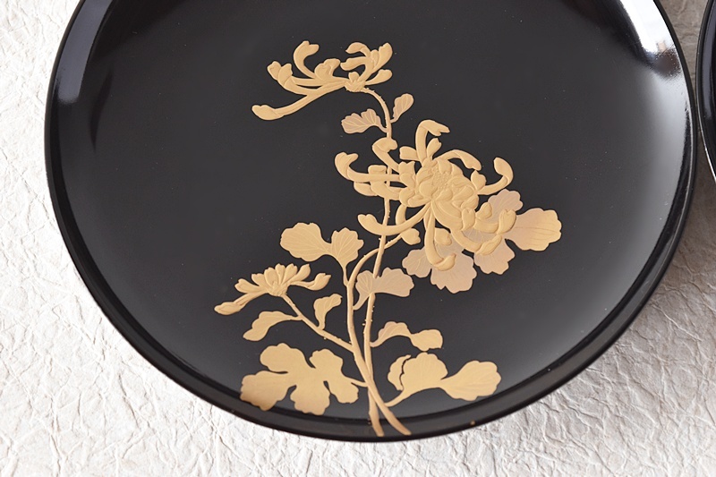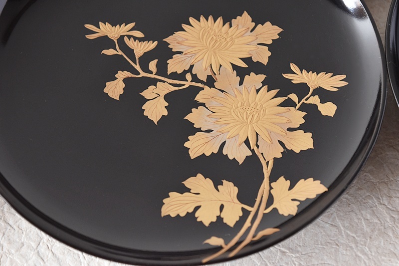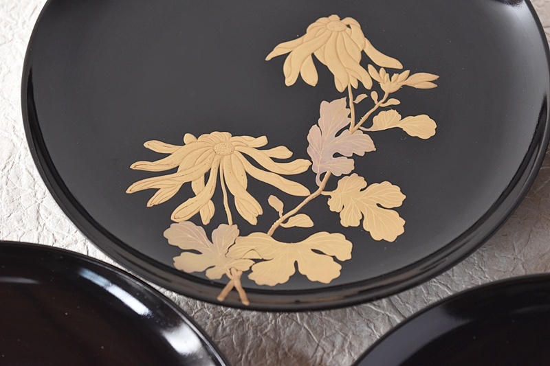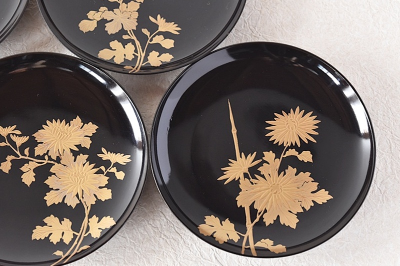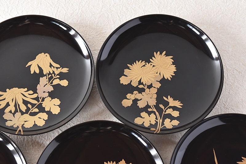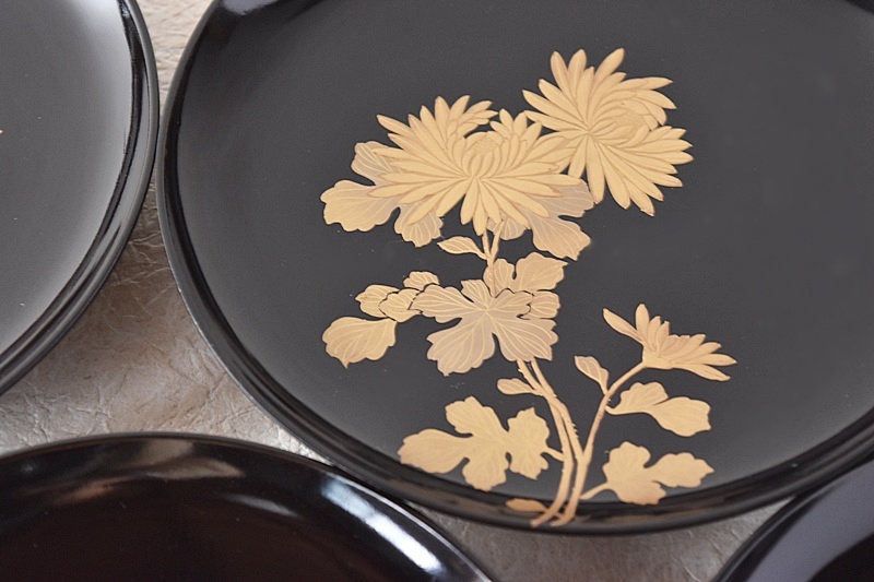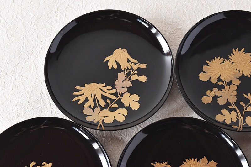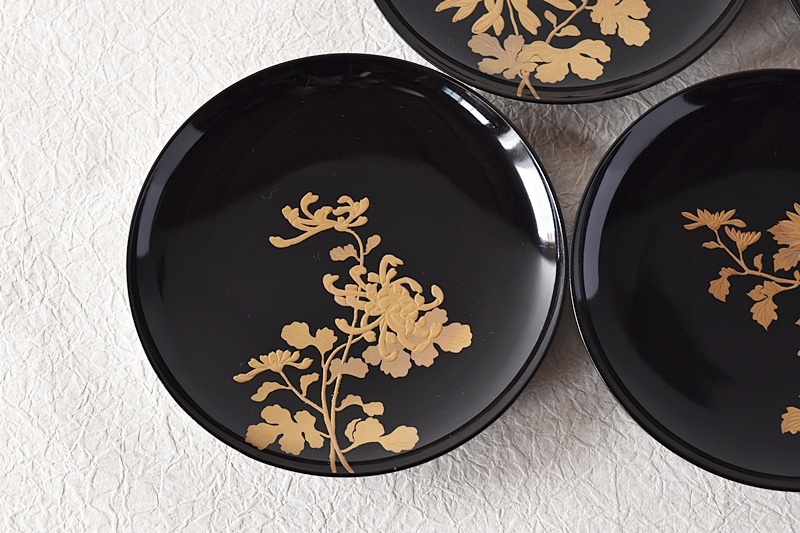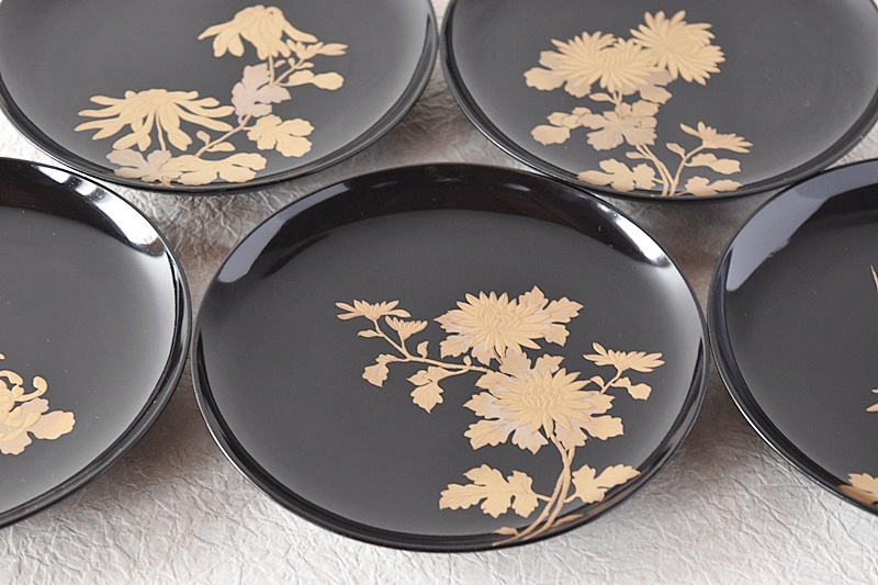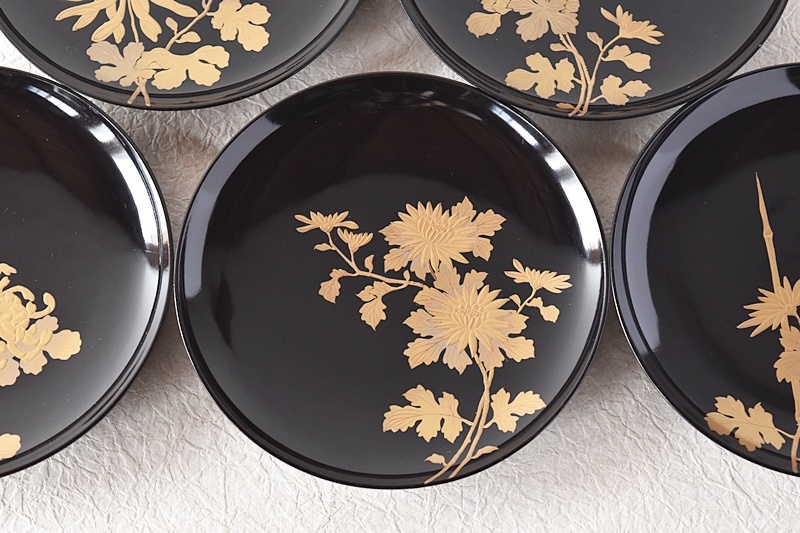 天然木製漆塗 時代蒔絵 菊図変わり金銀蒔絵 菓子皿 5客セット その四Sold Out