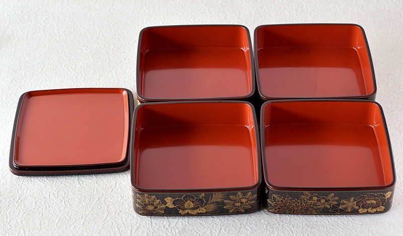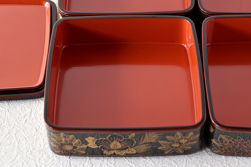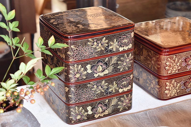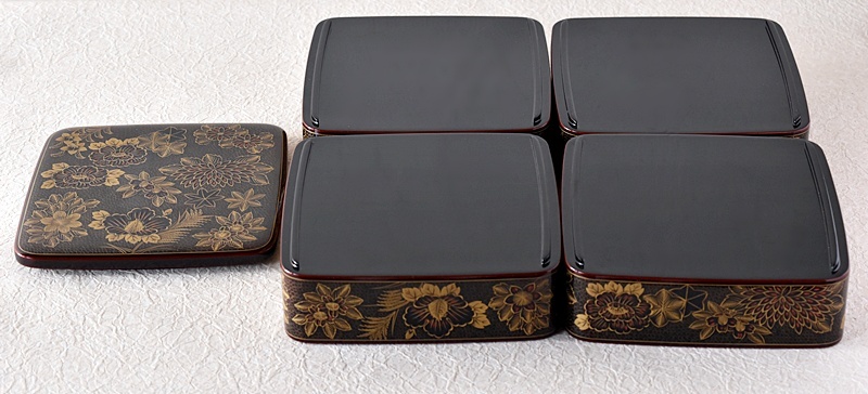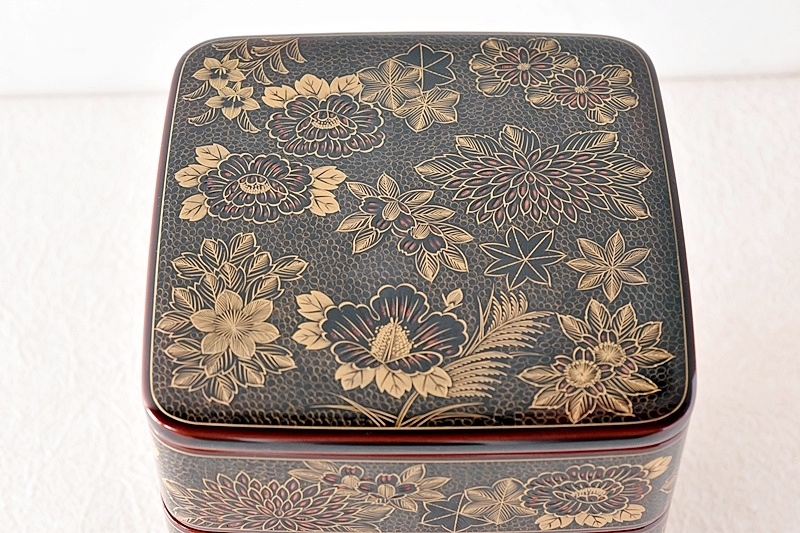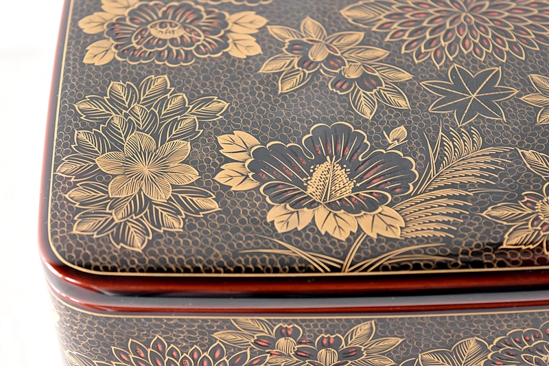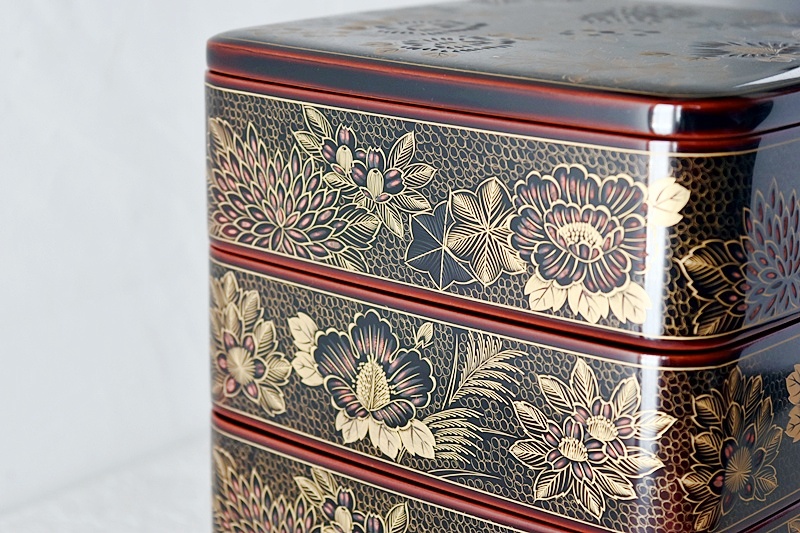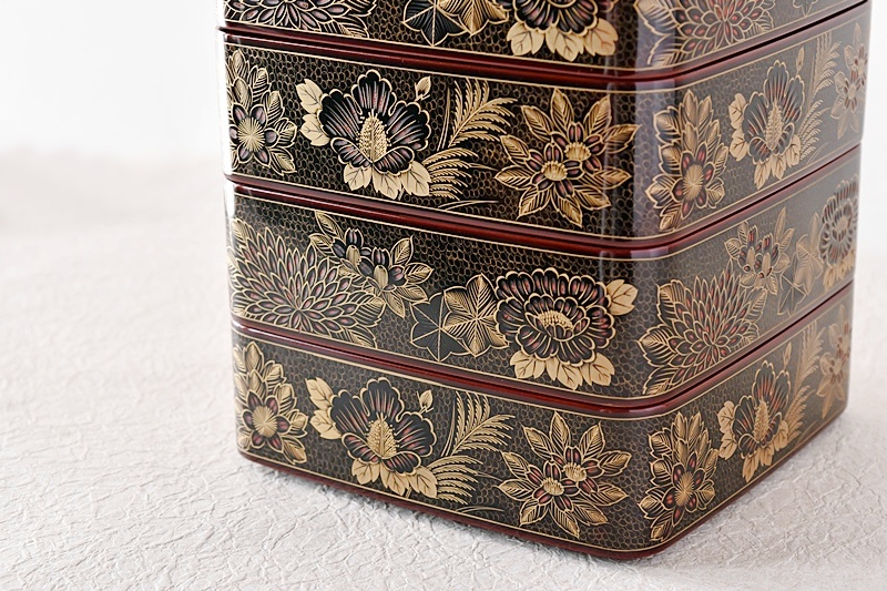 天然木製漆塗 輪島塗 沈金蒔絵 菊牡丹水仙楓草花 溜塗 少し小ぶりの四段重箱Sold Out