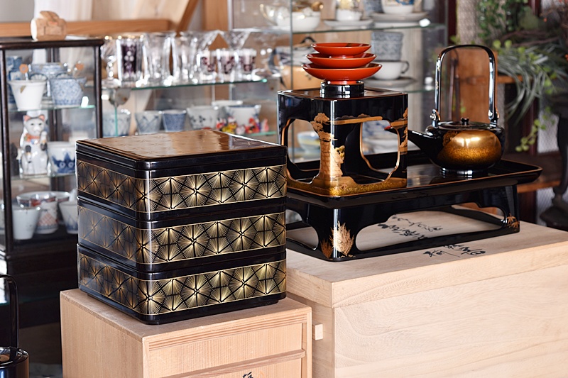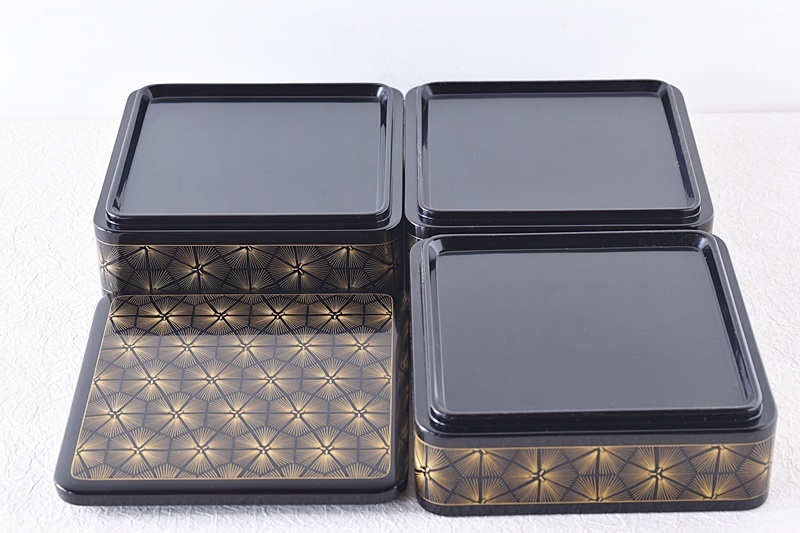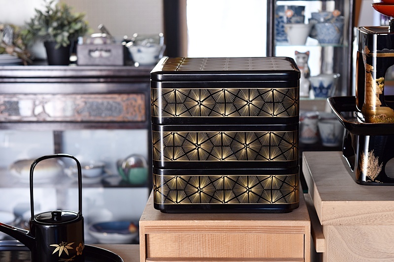 亀甲沈金蒔絵が全面に描かれた三段重箱です。