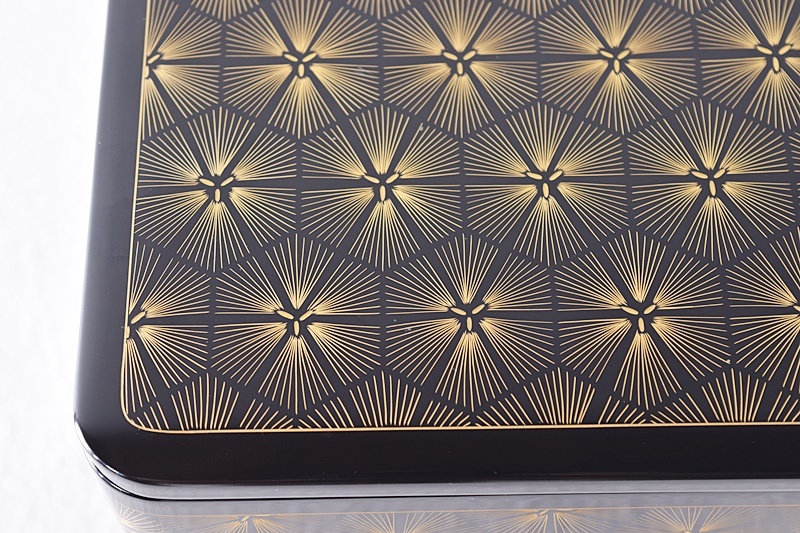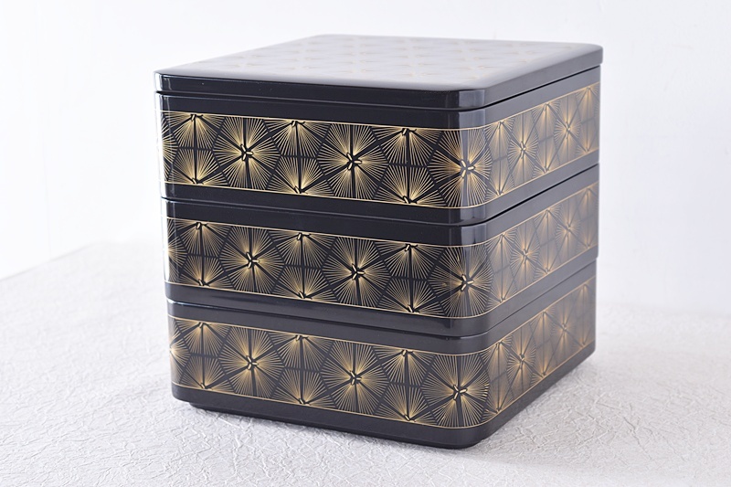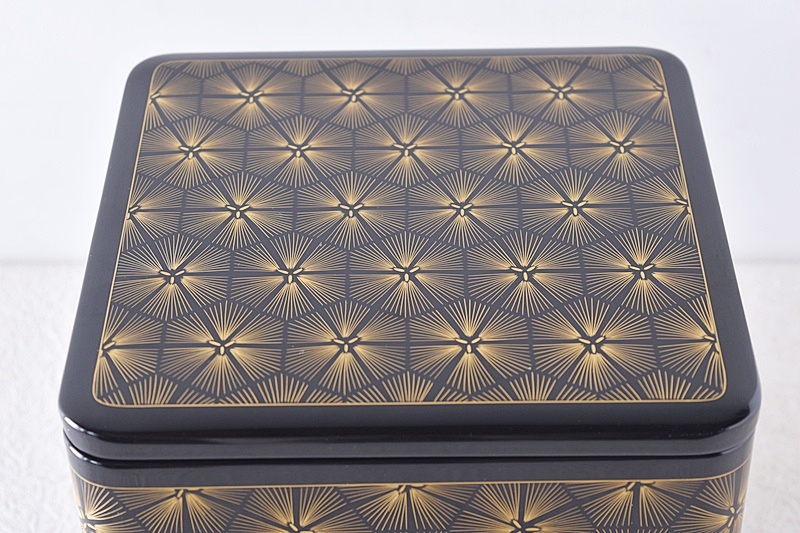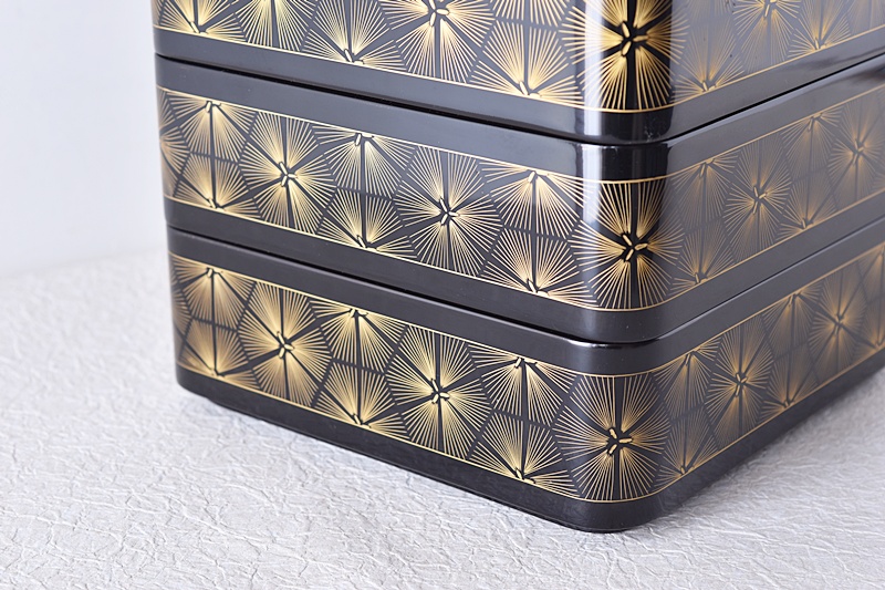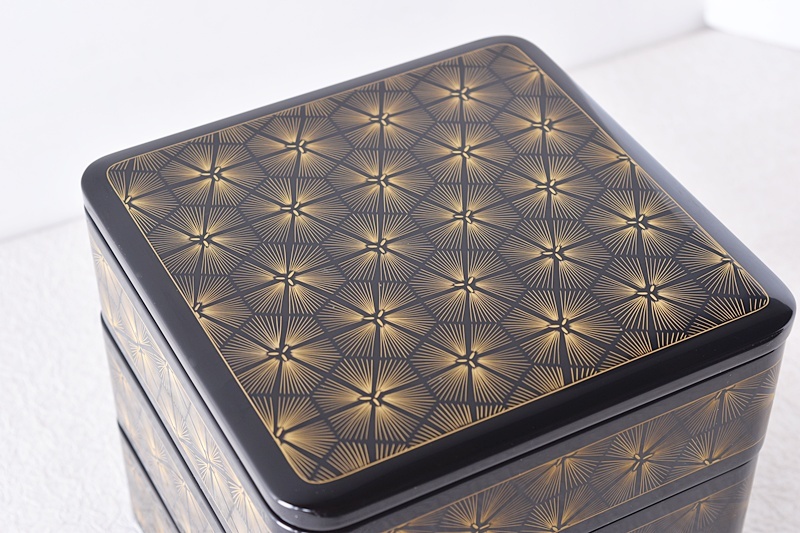 亀甲沈金蒔絵が全面に描かれた三段重箱です。