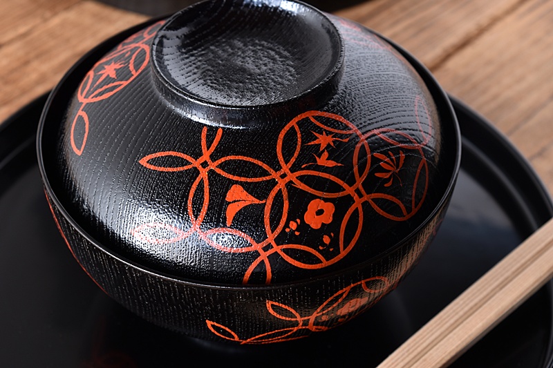 黒塗りに赤絵で七宝模様が描かれえた大振り煮物椀です。
