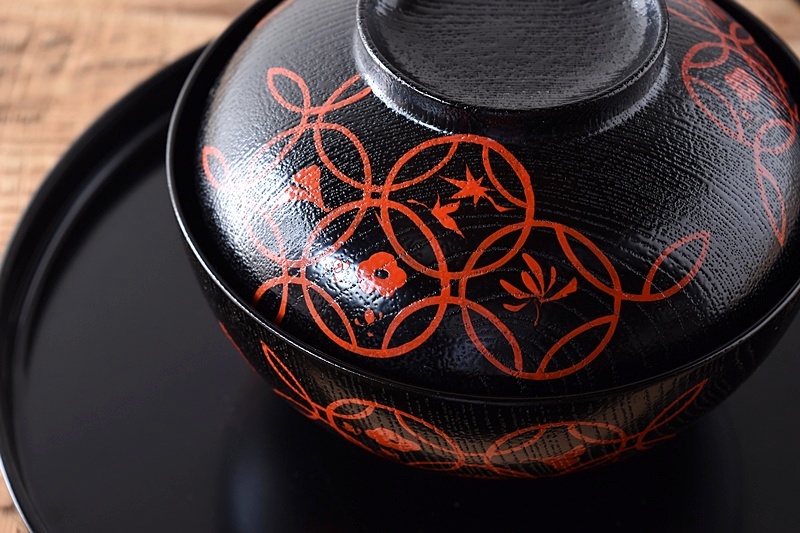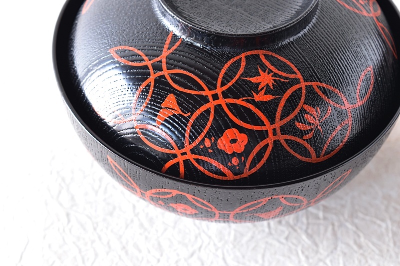黒塗りに赤絵で七宝模様が描かれえた大振り煮物椀です。