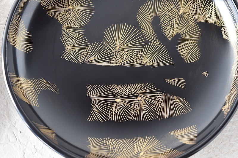 茶托には松葉の蒔絵、菓子皿には沈金蒔絵で松葉がたくさん描かれています。